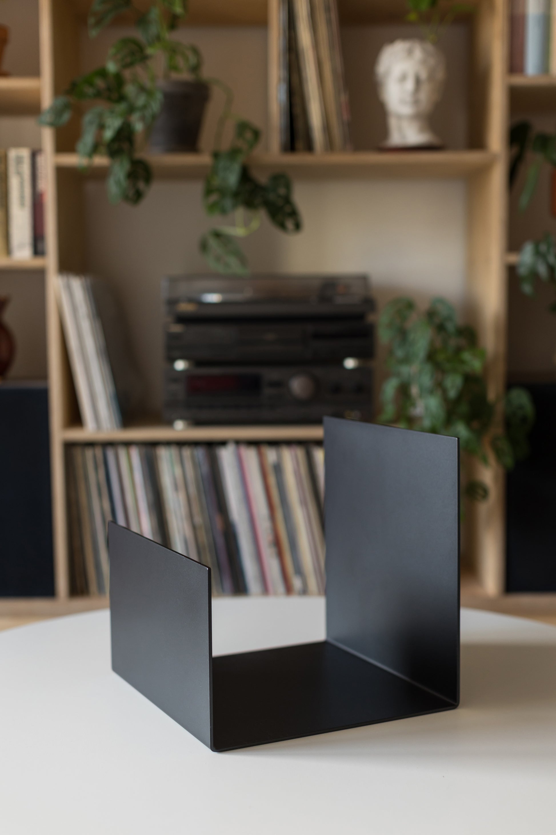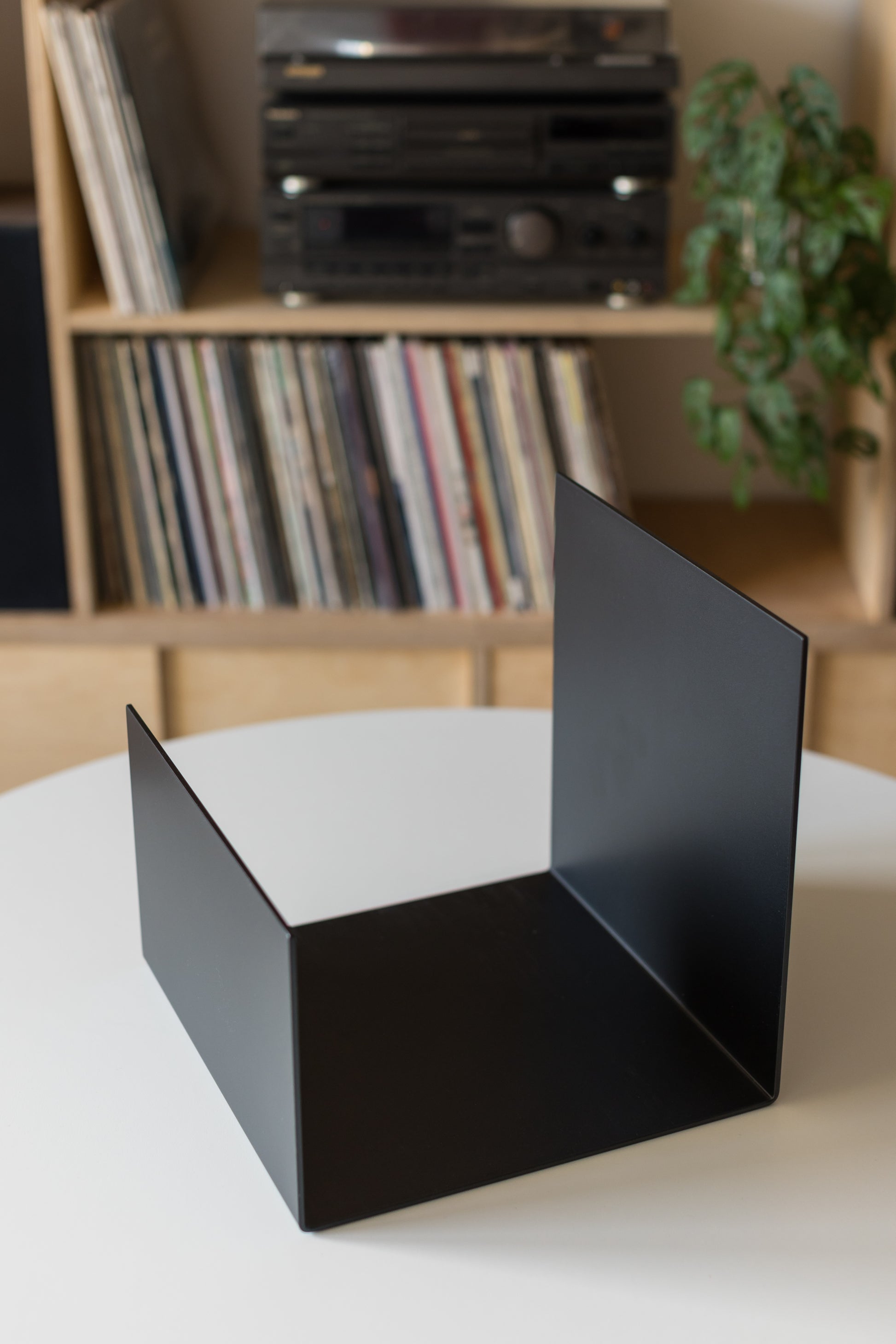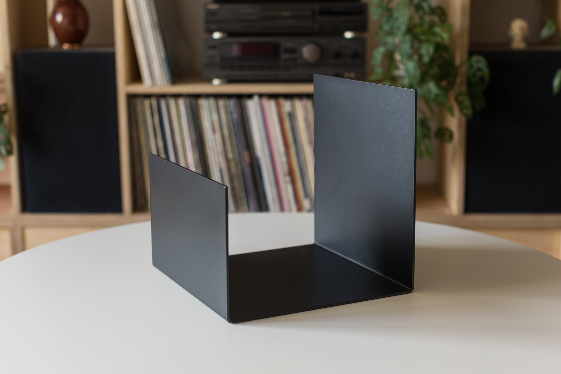 Minimalistyczny czarny stojak na winyle