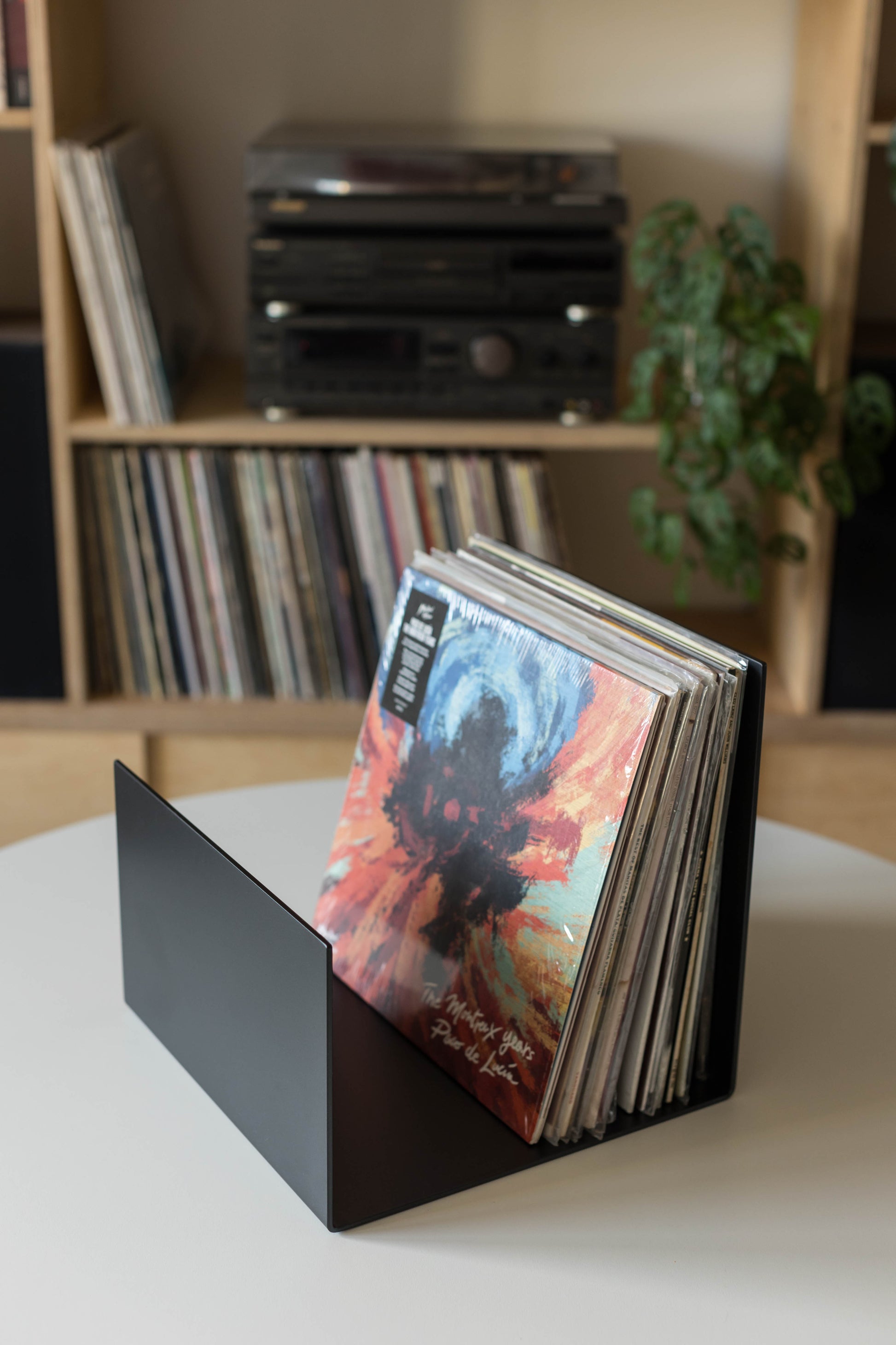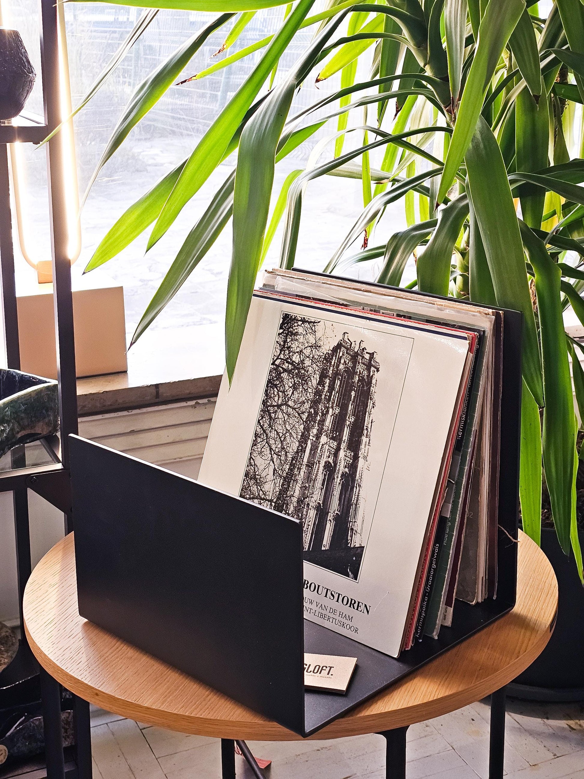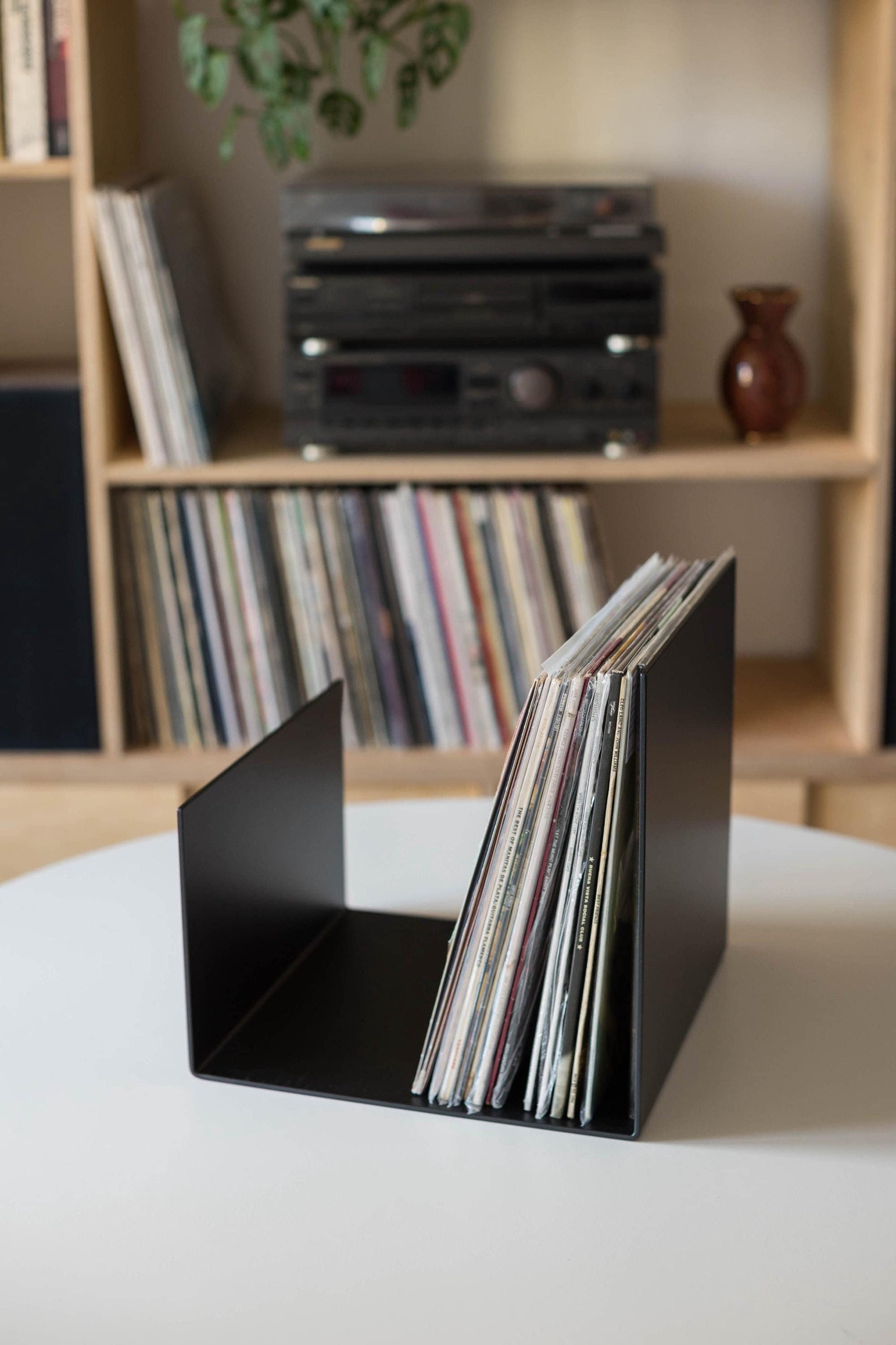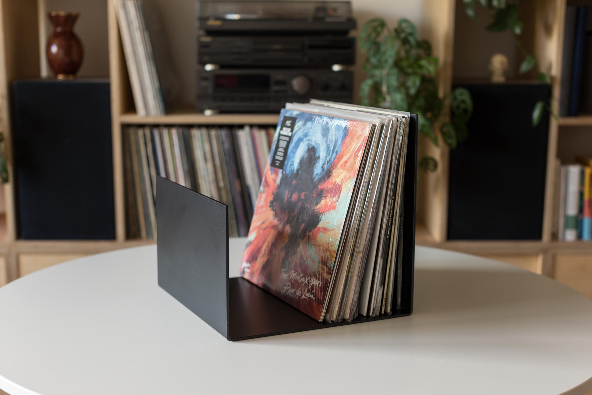 Minimalistyczny czarny stojak na winyle