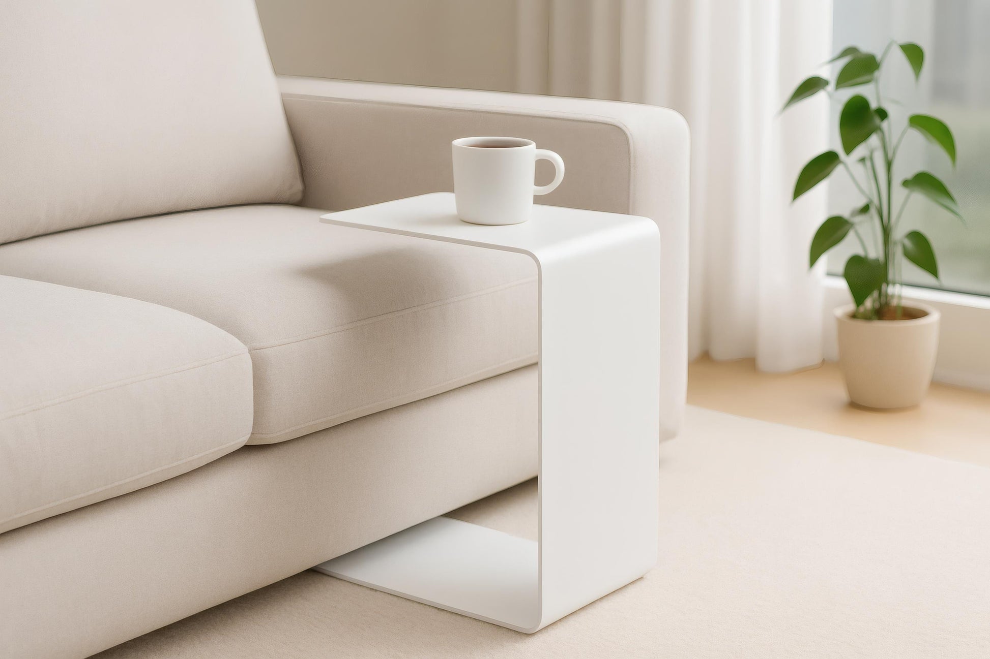 Wprowadź funkcjonalność i nowoczesną elegancję do wnętrza Twojego domu dzięki temu minimalistycznemu stolikowi bocznemu w kształcie litery C. Zaprojektowany tak, aby bez trudu wsunąć się pod sofę, stolik ten stanowi wygodną powierzchnię na kawę, laptopa, książkę - wszystko w zasięgu ręki.